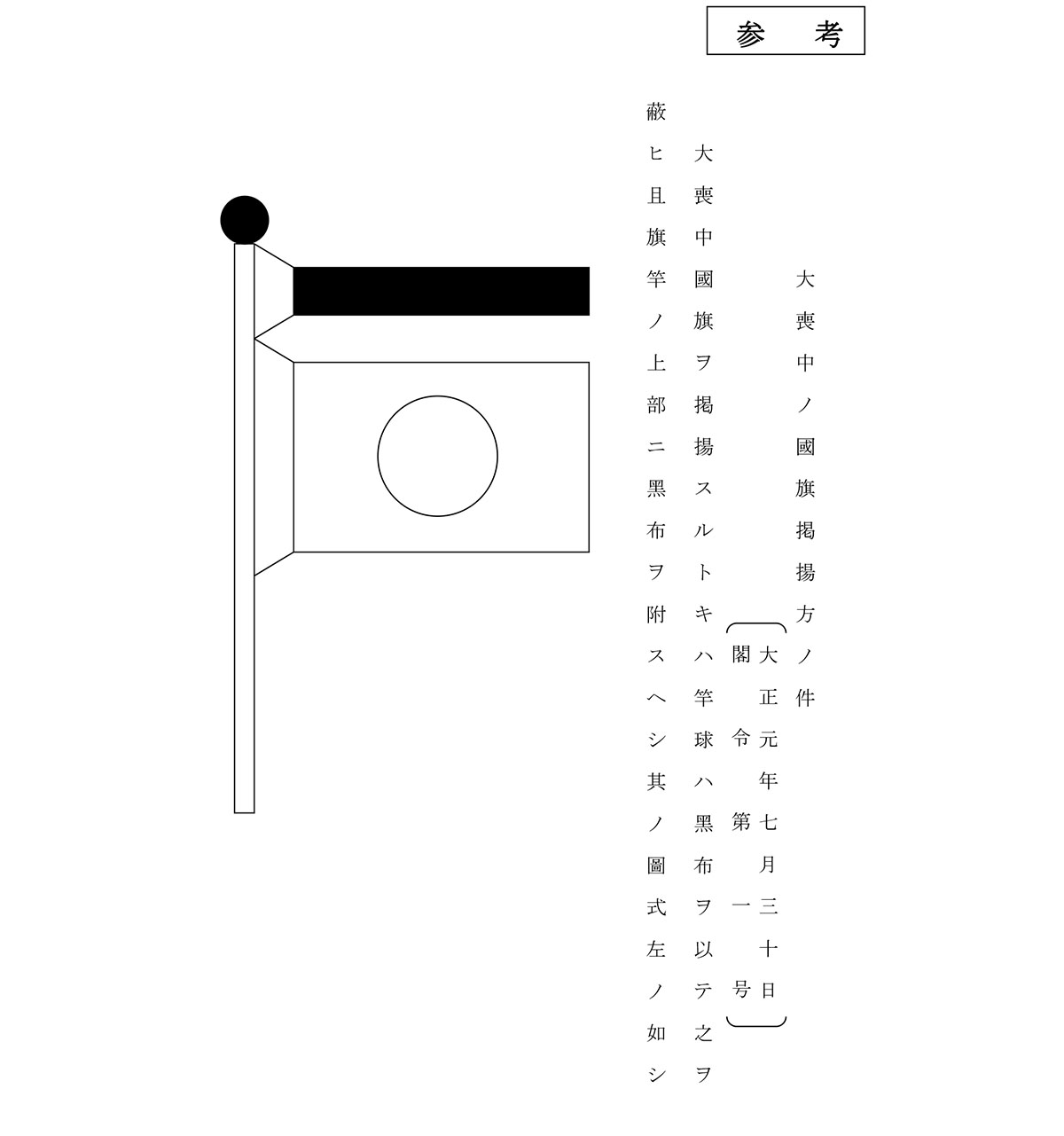 弔旗掲揚については、「大喪中ノ國旗掲揚方ノ件」(大正元年7月30日閣令第1号)に準拠し、竿球は黒布をもって覆い、旗竿の上部に黒布を付することとするが、弔旗として半旗掲揚の慣行のあるところでは、それに従ってもよいこと。