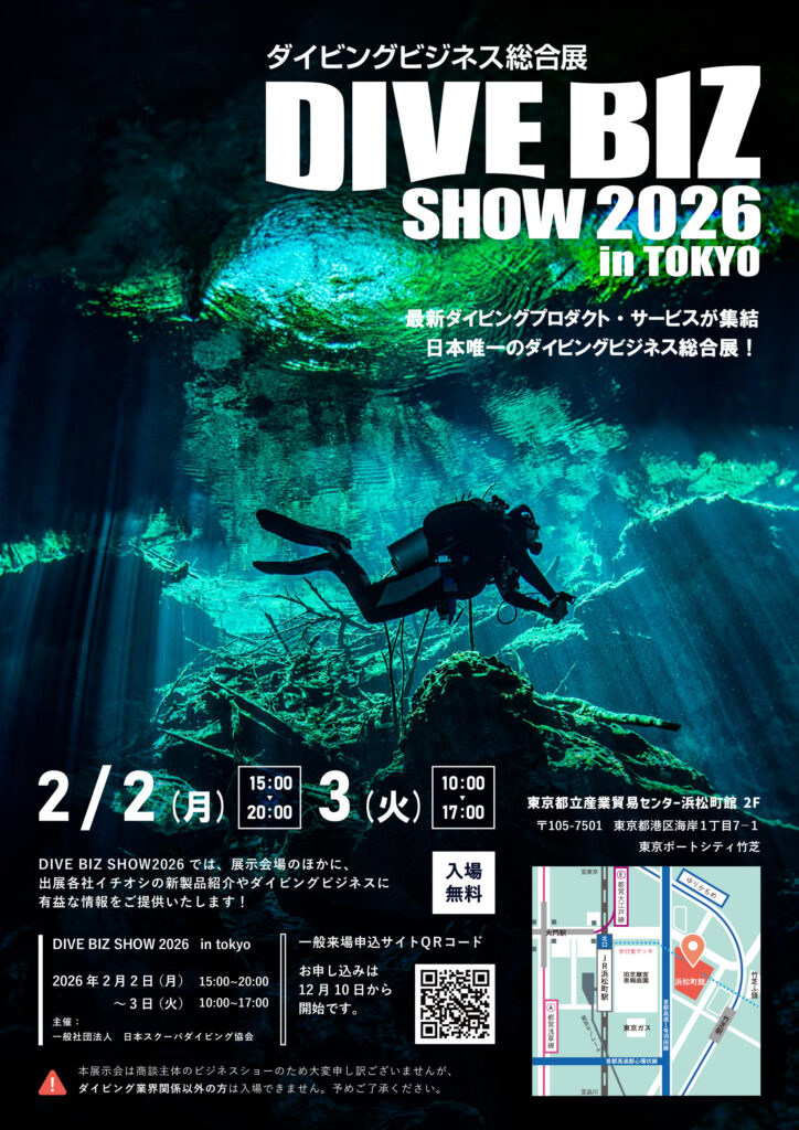 一般社団法人日本スクーバダイビング協会主催の展示会イベント「DIVE BIZ SHOW 2026 in TOKYO」が2026年2月2日~3日に、前回に引き続き東京都立産業貿易センター浜松町館で開催されることが決定しました。ぜひご参加ください。